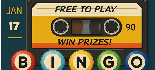 JOIN US JANUARY 17TH FOR MUSIC BINGO! MUSIC FROM ALL ERAS AND ALL GENRES. PRIZES FOR 1ST PLACE. FREE TO PLAY! SATURDY THE 17TH AT 8PM